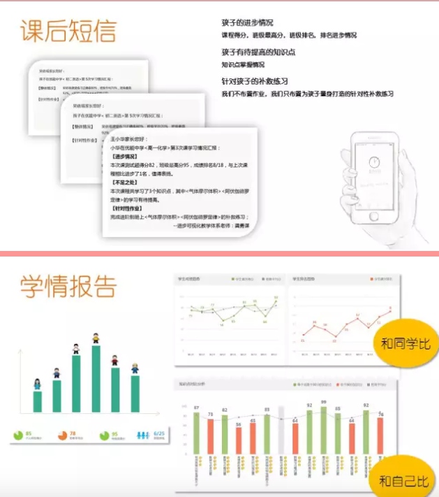 课后,可通过课后短信,自主查询和学情报告的方式更深入的了解学习情况。学会了什么?哪里还有不足?如何改善进步?一目了然。